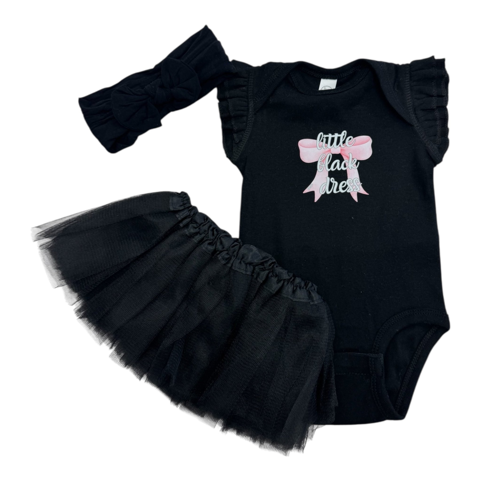 Every girl deserves a touch of classic charm, no matter her age! This playful 3-piece Little Black Dress Tutu set features a cozy ruffle baby onesie with a snap closure and a fun hand-designed "Little black dress" graphic, made at SoJo Boutique. Complete with a matching bow and a fluffy black tutu skirt.