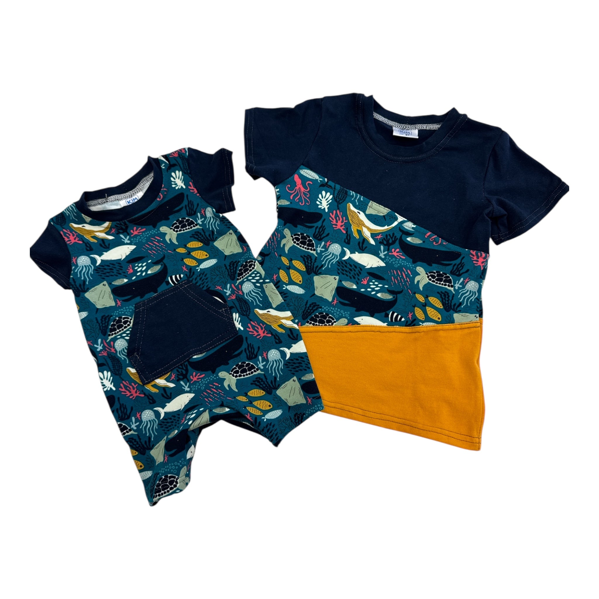 Dive into fun with these handmade Under The Sea tees from Kim Squared. Each piece showcases playful sea creature patterns. The tees add a splash of color with unique color blocking, making every outfit a joyful ocean-inspired look. Crafted locally with care, these one-of-a-kind pieces bring whimsy and comfort to your child's wardrobe.